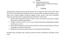 Dalam surat tersebut ditegaskan beberapa langkah strategis, di antaranya pendataan warga terdampak disertai dokumentasi, respons cepat terhadap informasi resmi dari instansi berwenang, menjaga kondisi masyarakat tetap kondusif, serta pelaporan situasi desa secara berkala.