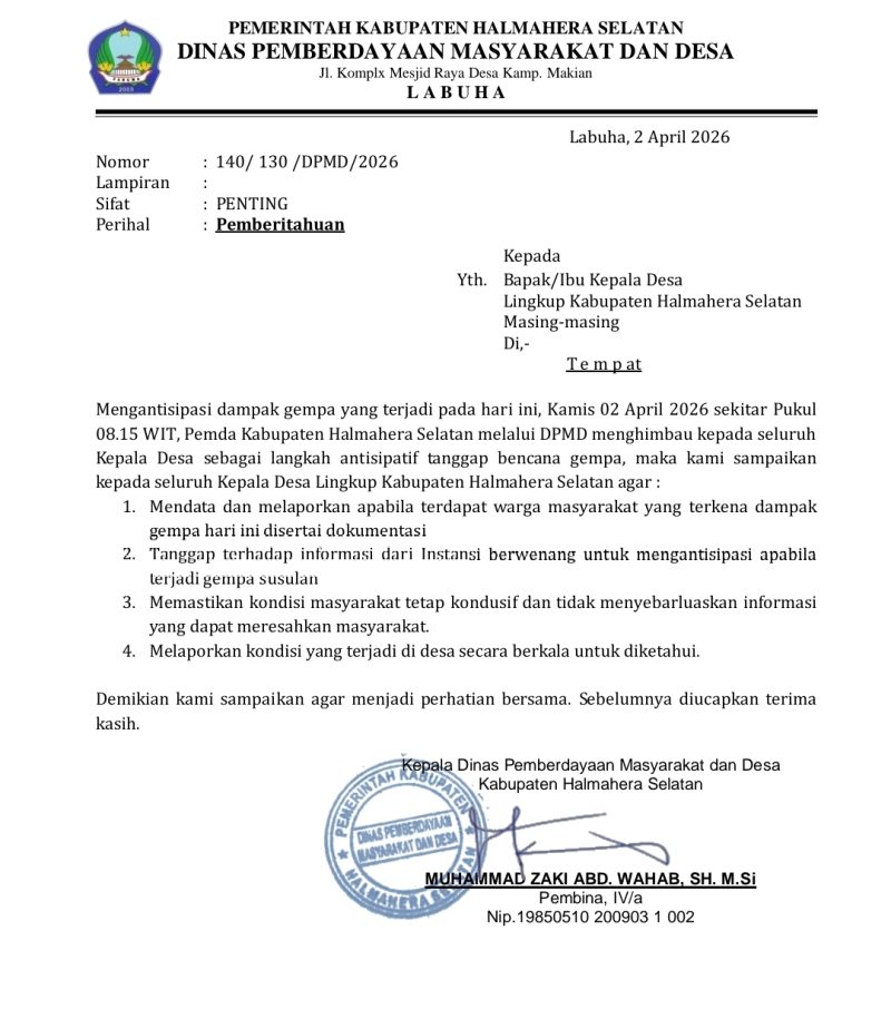 HALMAHERA SELATAN — Pemerintah Kabupaten Halmahera Selatan melalui Dinas Pemberdayaan Masyarakat dan Desa (DPMD) mengeluarkan imbauan resmi kepada seluruh kepala desa untuk meningkatkan kewaspadaan pasca gempa bumi yang terjadi pada Kamis, 2 April 2026.