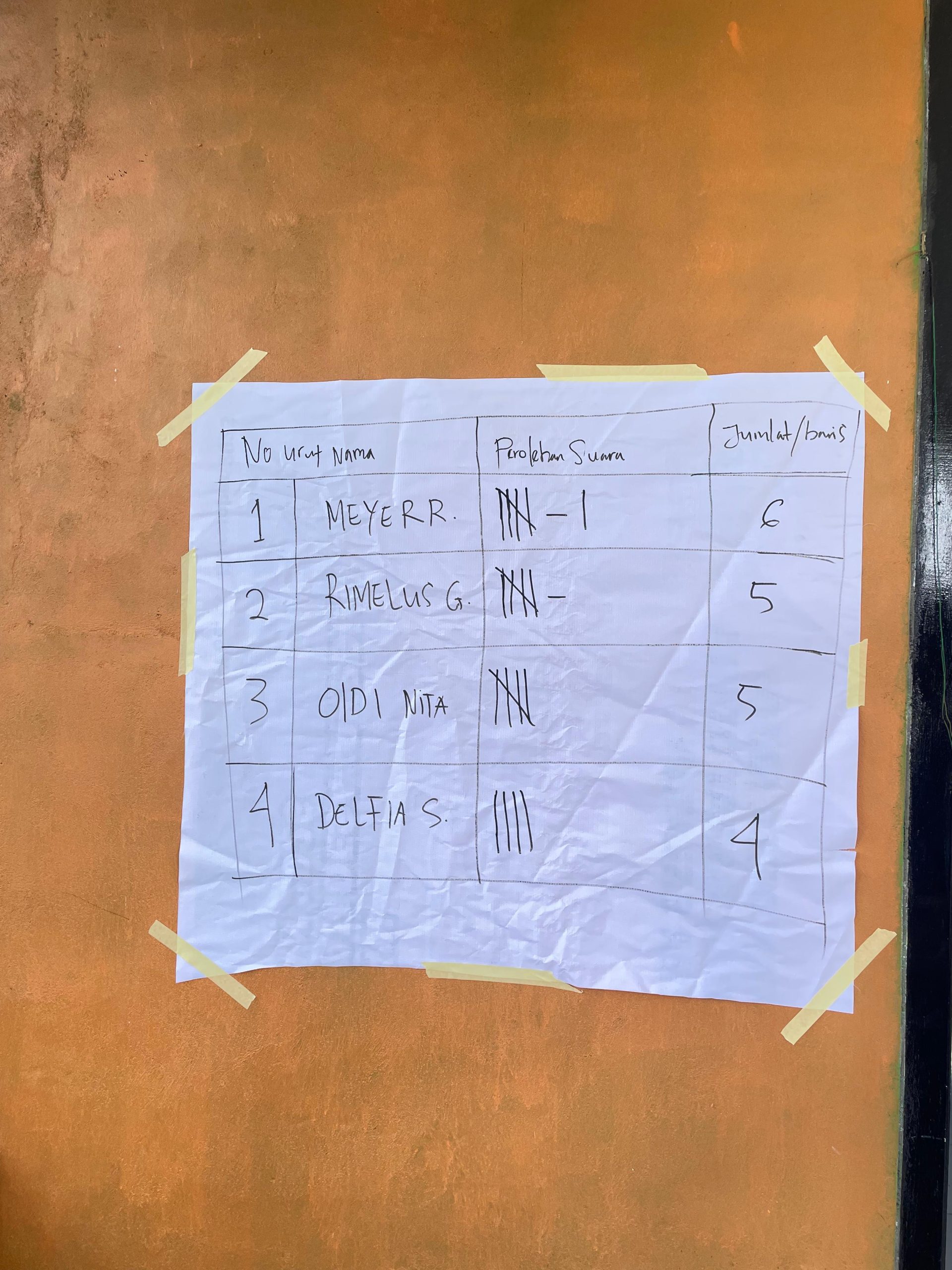 Berdasarkan hasil penghitungan suara, Meyer Repe memperoleh enam suara. Sementara dua kandidat lainnya, Rimelus Gorab dan Oldi Nita, masing-masing mengantongi lima suara. Adapun Delfia Sahepea berada di posisi berikutnya dengan perolehan empat suara.