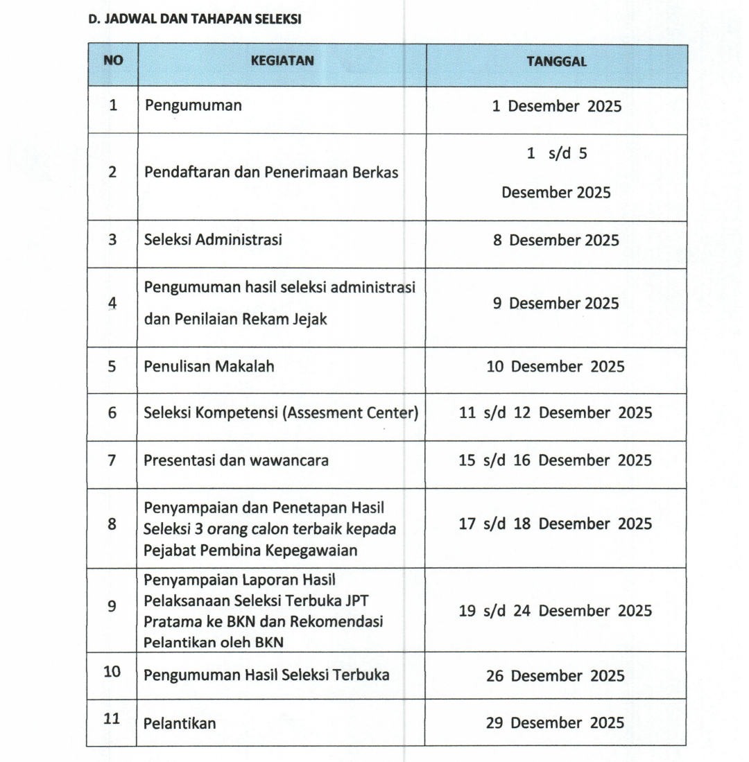 Pengumuman tersebut disampaikan melalui surat Nomor: 01/PANSEL.JPTP/2025 tertanggal 1 Desember 2025, yang dikeluarkan Panitia Seleksi Terbuka JPT Pratama. (2/13/2025)