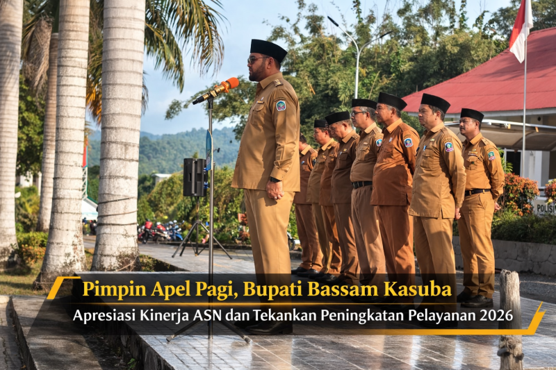 HALMAHERA SELATAN — Bupati Hasan Ali Bassam Kasuba memimpin apel pagi lingkup Pemerintah Kabupaten Halmahera Selatan, Senin (02/03/2026).