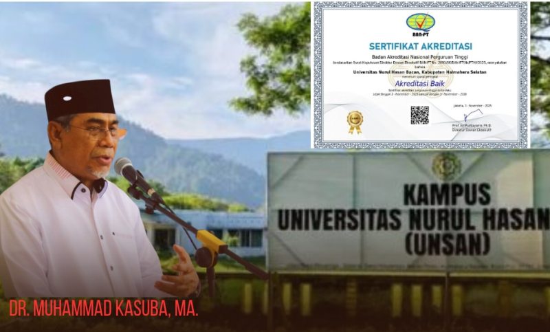 HALMAHERA SELATAN – Universitas Nurul Hasan (UNSAN) Bacan kembali menorehkan sejarah baru dalam dunia pendidikan Halmahera Selatan. Kampus kebanggaan masyarakat ini resmi meraih Akreditasi “Baik” dari Badan Akreditasi Nasional Perguruan Tinggi (BAN-PT) melalui Surat Keputusan Nomor 2893/SK/BAN-PT/Ak/PT/XI/2025.